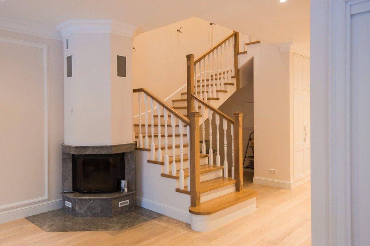 Основой для ступеней и перил послужил благородный бук — его медовый оттенок и прочная текстура создают ощущение тепла и стабильности. Чтобы конструкция не выглядела громоздкой, подступенки и боковые торцы мы оштукатурили и окрасили в белый. Этот контраст, дополненный изящными резными балясинами светлого оттенка, позволил гармонично вписать монументальную лестницу в классический интерьер дома.