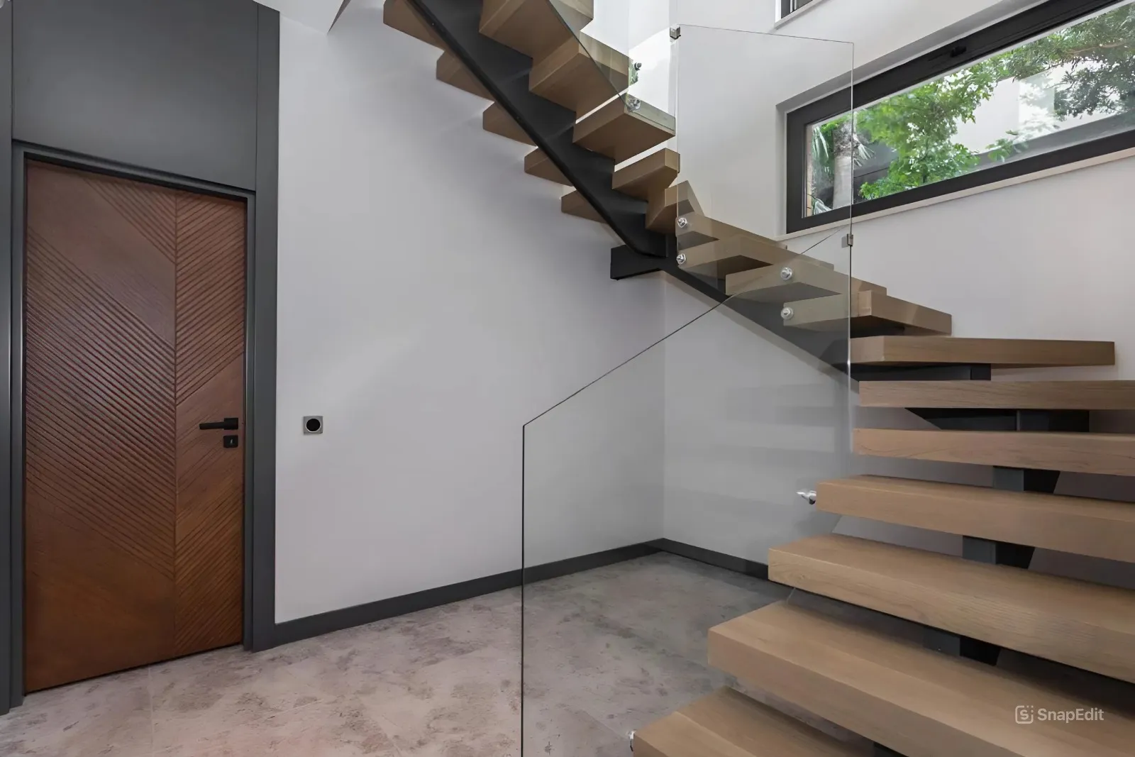 1. Подчеркнем современный дизайн вашей лестницы на монокосоуре теплотой натурального дерева. Облицовка забежными ступенями сделает конструкцию визуально легкой и стильной.